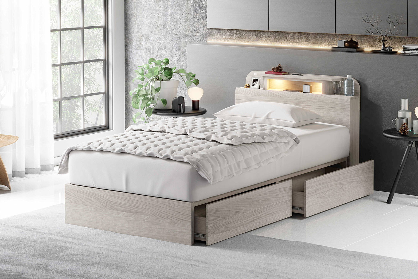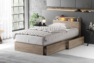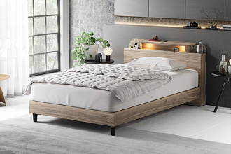 LED照明と1口コンセントを備えた、シンプルで機能的なベッドフレーム。KD-ST・LEG-ST・2DR・3DRの4種類のボトムから、お部屋やライフスタイルに合わせてお選びいただけます。カラーはWA(ウォールナット)とGRY(グレー)の2色展開。