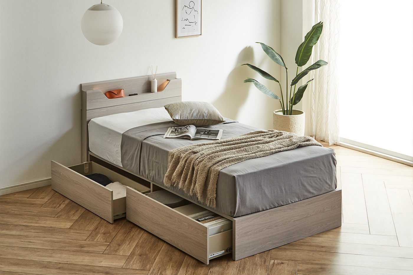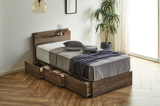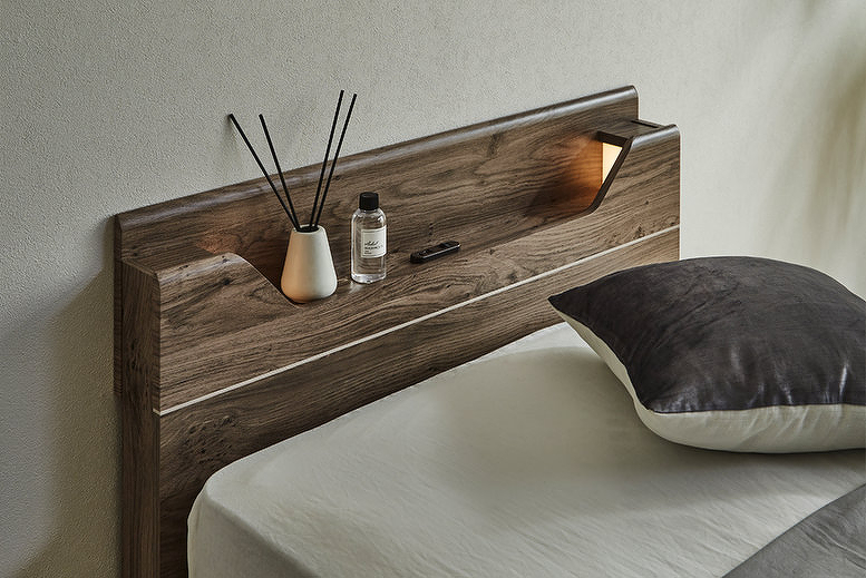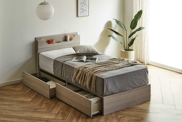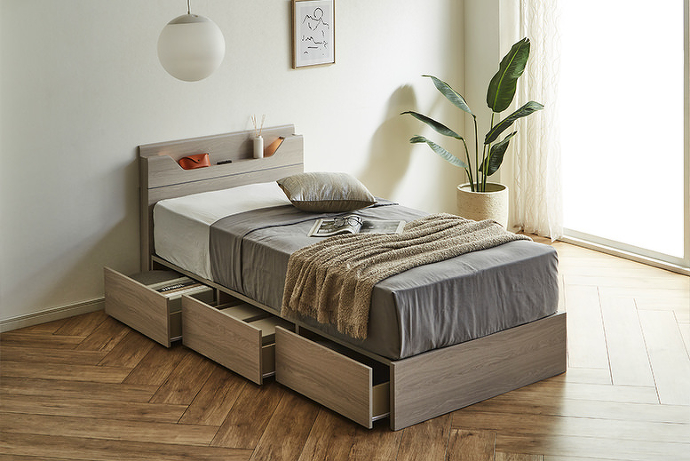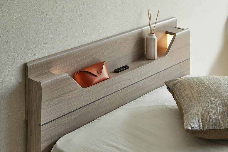 LED照明と1口コンセントを備えた、コンパクトなヘッドボードが特徴のベッドフレーム。KD-ST・LEG-ST・2DR・3DRの4種類のボトムから、お部屋やライフスタイルに合わせてお選びいただけます。カラーはWA(ウォールナット)とGRY(グレー)の2色展開。